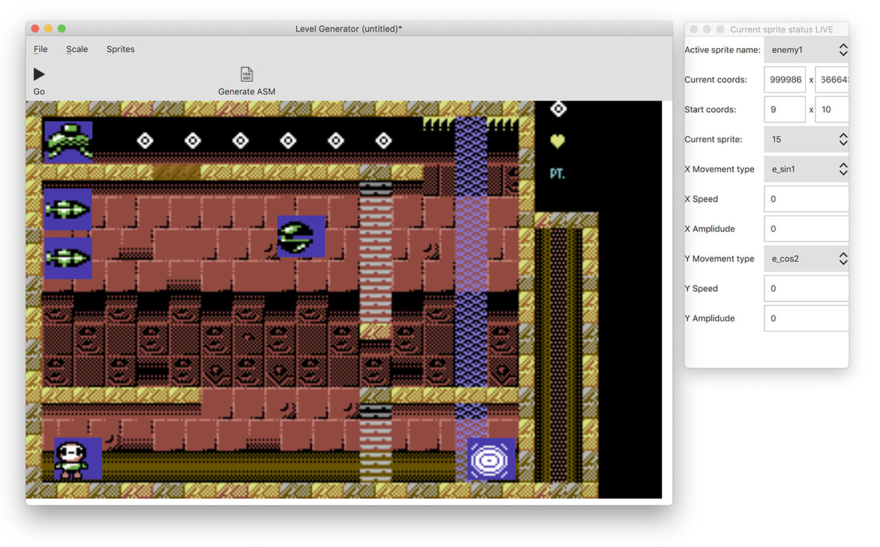 Rozmieszczenie przeciwników robione jest w kodzie. Jesteśmy w takim momencie, że w zasadzie w silniku gry możemy skonfigurować dowolny ruch naszych przeciwników. Programowanie tego jednak w kodzie, w assemblerze (ten fragment mam zakodowany częściowo w kick-asm i w kick-c), jest dość upierdliwe – żmudne i czasochłonne. Yugorin zapytał czy nie przydał by się do tego jakiś dedykowany edytor i jak by co to poprosi BroneCk’a z Samaru aby nam taki napisał. No i BroneCk napisał. Mamy edytor do rozmieszczania sprajtów na ekranie! Wow! Jeszcze większe Wow bo program działa na Windows, mac OS i Linux. Kto wie, może kiedyś uda nam się go gdzieś udostępnić. Wygląda to tak: