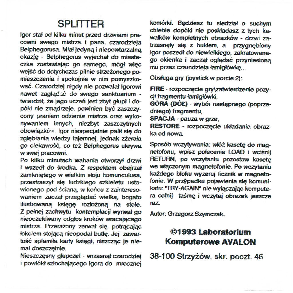 Dla takich akcji powstał C64portal.pl! Po artykule Tenchiego skontaktował się z nami jeden z czytelników. Powiedział, że chyba może coś do tematu Splittera dodać.